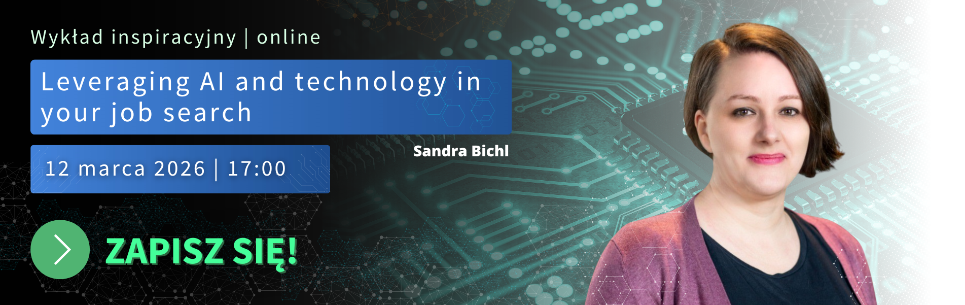 Zapraszamy na kolejny webinar z cyklu Wykładów Inspiracyjnych, który odbędzie się 12 marca 2026 o 17:00 „Leveraging AI and technology in your job search” poprowadzi Sandra Bichl – Założycielka Career