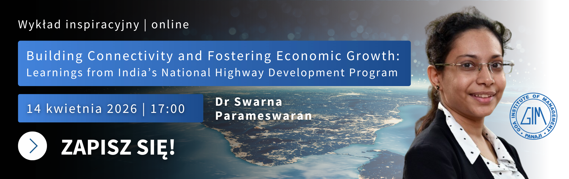 14 kwietnia 2026 o godz. 17:00 odbędzie się kolejny webinar z cyklu Wykładów Inspiracyjnych. „Building Connectivity and Fostering Economic Growth: Learnings from India’s National Highway Development Program” poprowadzi Dr. Swarna